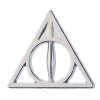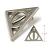 Bazový prútik v origináli je označovaný ako Elder Wand. Magický a pradávny predmet, čarovná palička, ktorá robí z toho, kto ju používa, nepremožiteľného kúzelníka(palička vytvorená z bazového dreva).V symbole je predstavovaná vo vertikále. Kameň vzkriesenia v origináli je označovaný ako "resurrection stone". Tento kameň dokáže podľa príbehu navracať mŕtvych ľudí späť do sveta živých. Moc tohto kameňa spočíva v tom, že privedie mŕtveho späť na tento svet v tejto prízračnej podobe, v ktorej sem už nepatrí. V symbole je táto relikvia predstavovaná kruhom vnútri trojuholníka, nakresleným cez zvislú čiaru. Neviditeľný plášť v origináli je označovaný ako Cloak of invisibility.